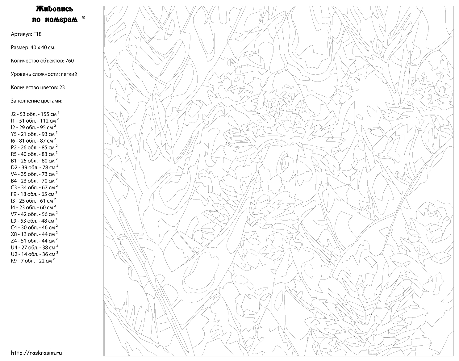 Количество красок от 18 до 24. Картина раскрашивается без смешивания красок. Высококачественные акриловые краски собственного производства сделают вашу картину яркой и уникальной. Все необходимые материалы есть в комплекте: натуральный хлопковый холст, натянутый на деревянный подрамник, баночки с акриловыми красками на водной основе, 2 кисти из качественного нейлона, схема раскрашивания, инструкция. Просто закрашивайте участки красками с соответствующим номером.
