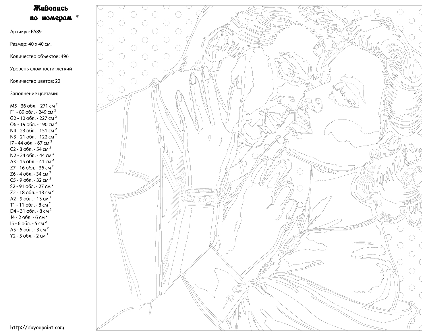 Количество красок от 18 до 24. Картина раскрашивается без смешивания красок. Высококачественные акриловые краски собственного производства сделают вашу картину яркой и уникальной. Все необходимые материалы есть в комплекте: натуральный хлопковый холст, натянутый на деревянный подрамник, баночки с акриловыми красками на водной основе, 2 кисти из качественного нейлона, схема раскрашивания, инструкция. Просто закрашивайте участки красками с соответствующим номером.