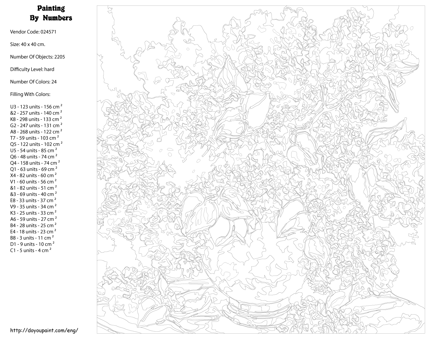 Количество красок от 18 до 24. Картина раскрашивается без смешивания красок. Высококачественные акриловые краски собственного производства сделают вашу картину яркой и уникальной. Все необходимые материалы есть в комплекте: натуральный хлопковый холст, натянутый на деревянный подрамник, баночки с акриловыми красками на водной основе, 2 кисти из качественного нейлона, схема раскрашивания, инструкция. Просто закрашивайте участки красками с соответствующим номером.