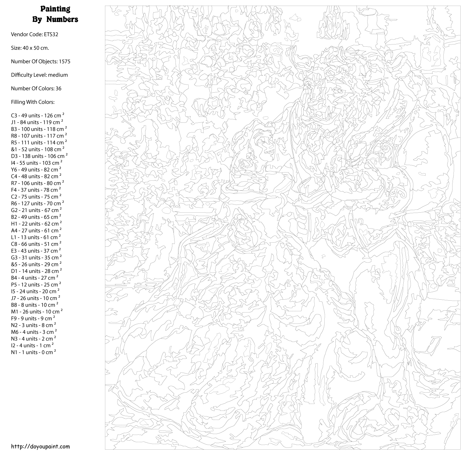 Количество красок от 18 до 24. Картина раскрашивается без смешивания красок. Высококачественные акриловые краски собственного производства сделают вашу картину яркой и уникальной. Все необходимые материалы есть в комплекте: натуральный хлопковый холст, натянутый на деревянный подрамник, баночки с акриловыми красками на водной основе, 2 кисти из качественного нейлона, схема раскрашивания, инструкция. Просто закрашивайте участки красками с соответствующим номером.