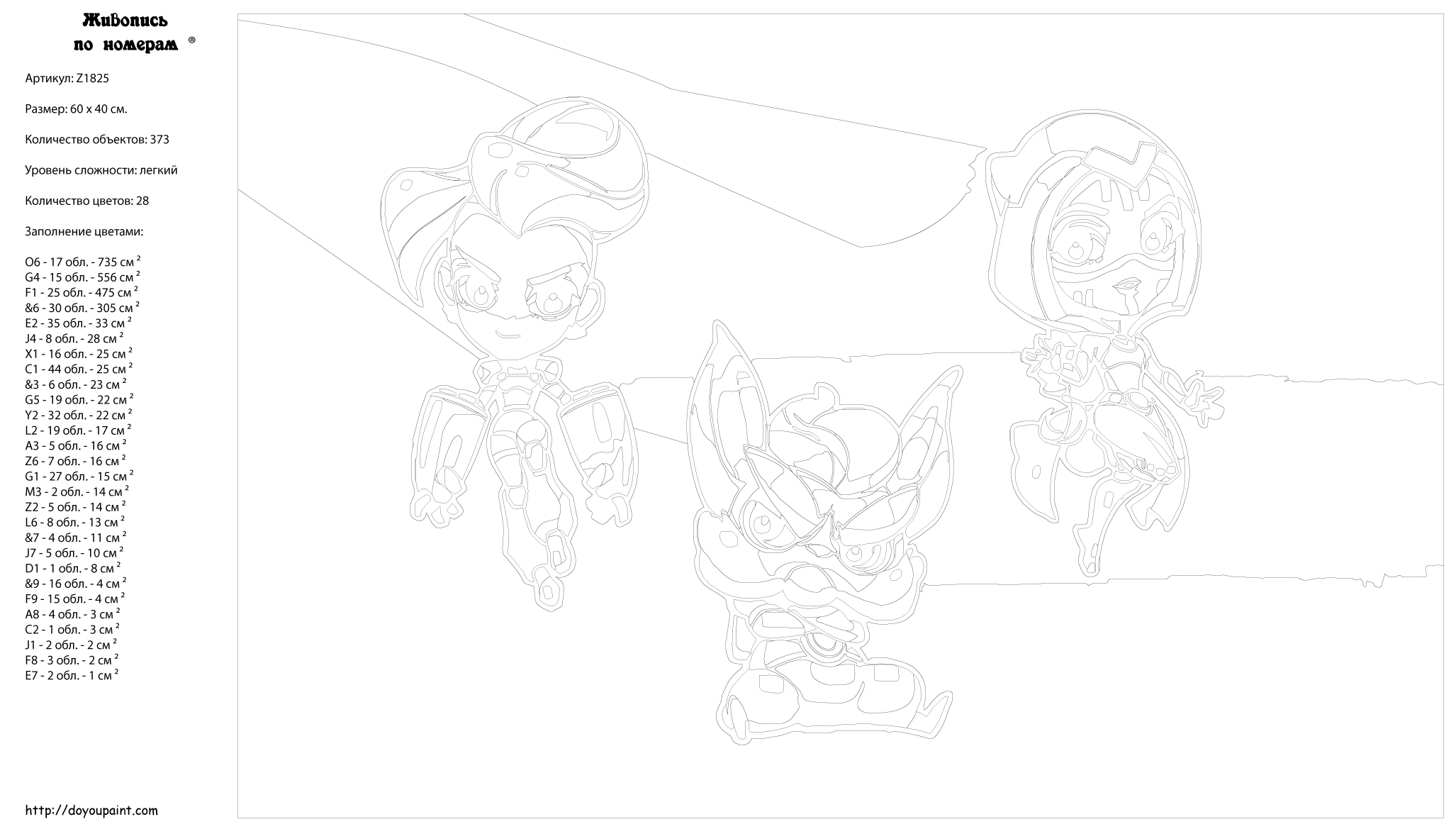Количество красок от 18 до 24. Картина раскрашивается без смешивания красок. Высококачественные акриловые краски собственного производства сделают вашу картину яркой и уникальной. Все необходимые материалы есть в комплекте: натуральный хлопковый холст, натянутый на деревянный подрамник, баночки с акриловыми красками на водной основе, 2 кисти из качественного нейлона, схема раскрашивания, инструкция. Просто закрашивайте участки красками с соответствующим номером.