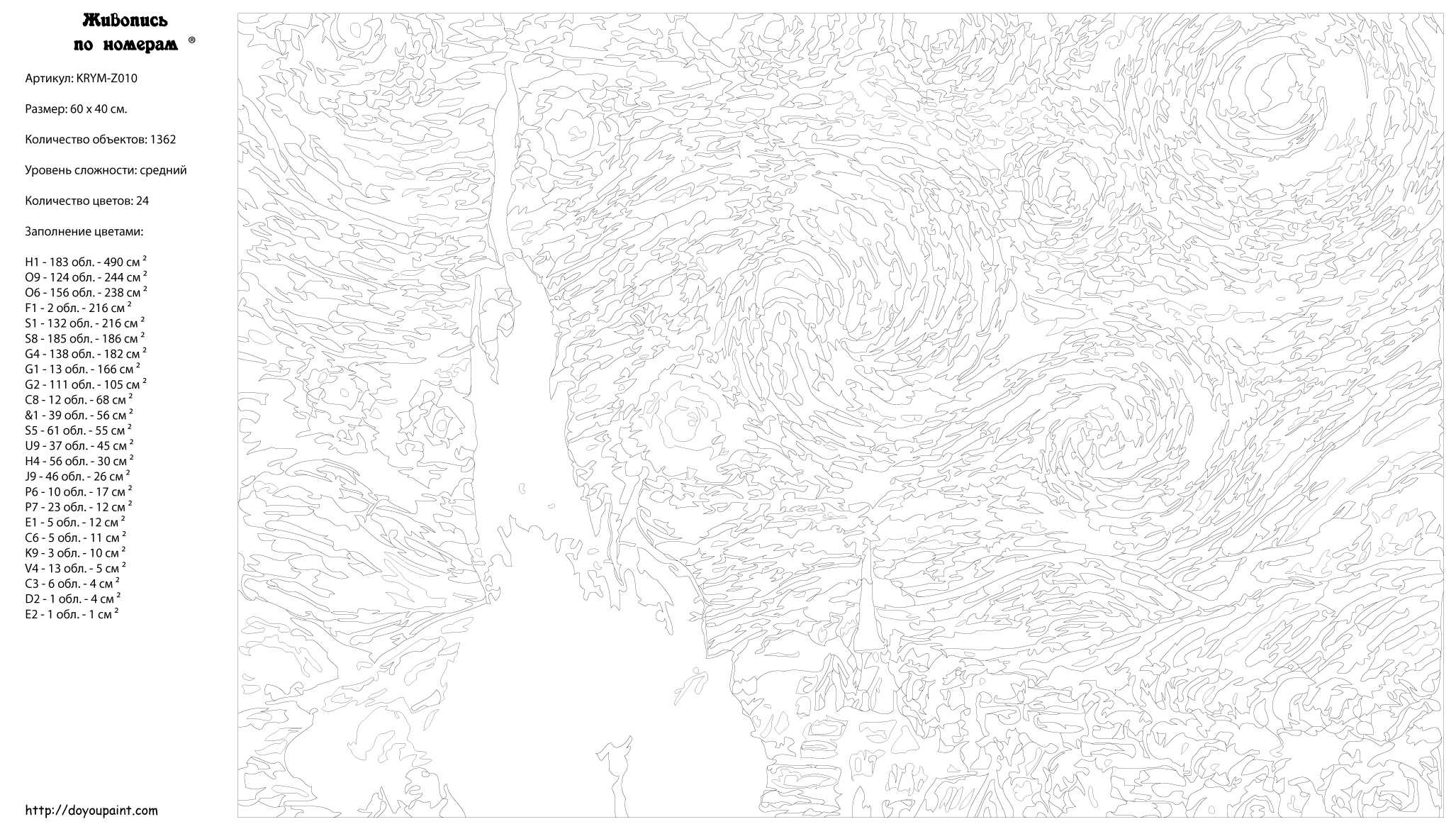 Количество красок от 18 до 24. Картина раскрашивается без смешивания красок. Высококачественные акриловые краски собственного производства сделают вашу картину яркой и уникальной. Все необходимые материалы есть в комплекте: натуральный хлопковый холст, натянутый на деревянный подрамник, баночки с акриловыми красками на водной основе, 2 кисти из качественного нейлона, схема раскрашивания, инструкция. Просто закрашивайте участки красками с соответствующим номером.
