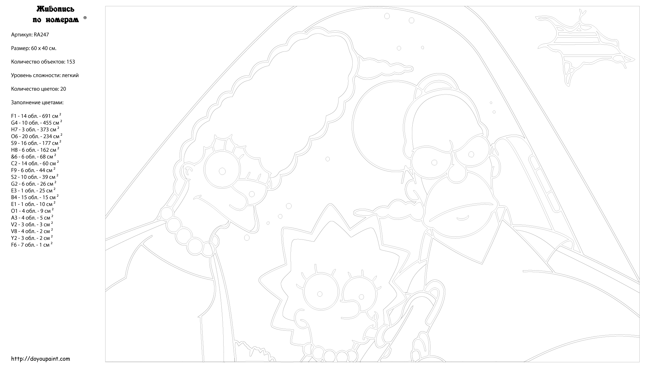 Количество красок от 18 до 24. Картина раскрашивается без смешивания красок. Высококачественные акриловые краски собственного производства сделают вашу картину яркой и уникальной. Все необходимые материалы есть в комплекте: натуральный хлопковый холст, натянутый на деревянный подрамник, баночки с акриловыми красками на водной основе, 2 кисти из качественного нейлона, схема раскрашивания, инструкция. Просто закрашивайте участки красками с соответствующим номером.